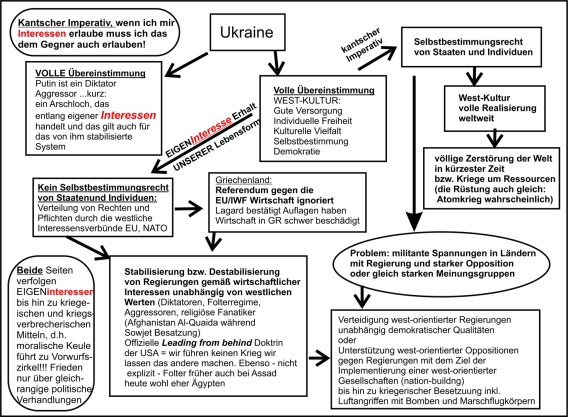 Dies hat wiederum innere Spannungen zur Folge, die zum einen die Tendenz haben, zu undemokratischen Eigriffen gegenüber der Opposition zu führen und zum anderen vom jeweiligen Gegner propagandistisch oder auch für direkte Einflussnahmen benutzt werden können, was die Kriegswahrscheinlichkeit wieder erhöht lässt. Es gilt deshalb nur eines: