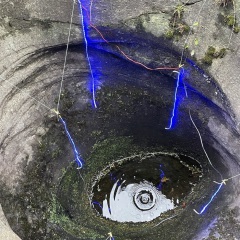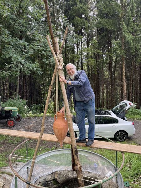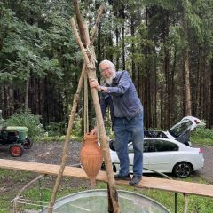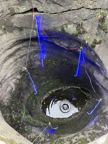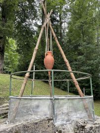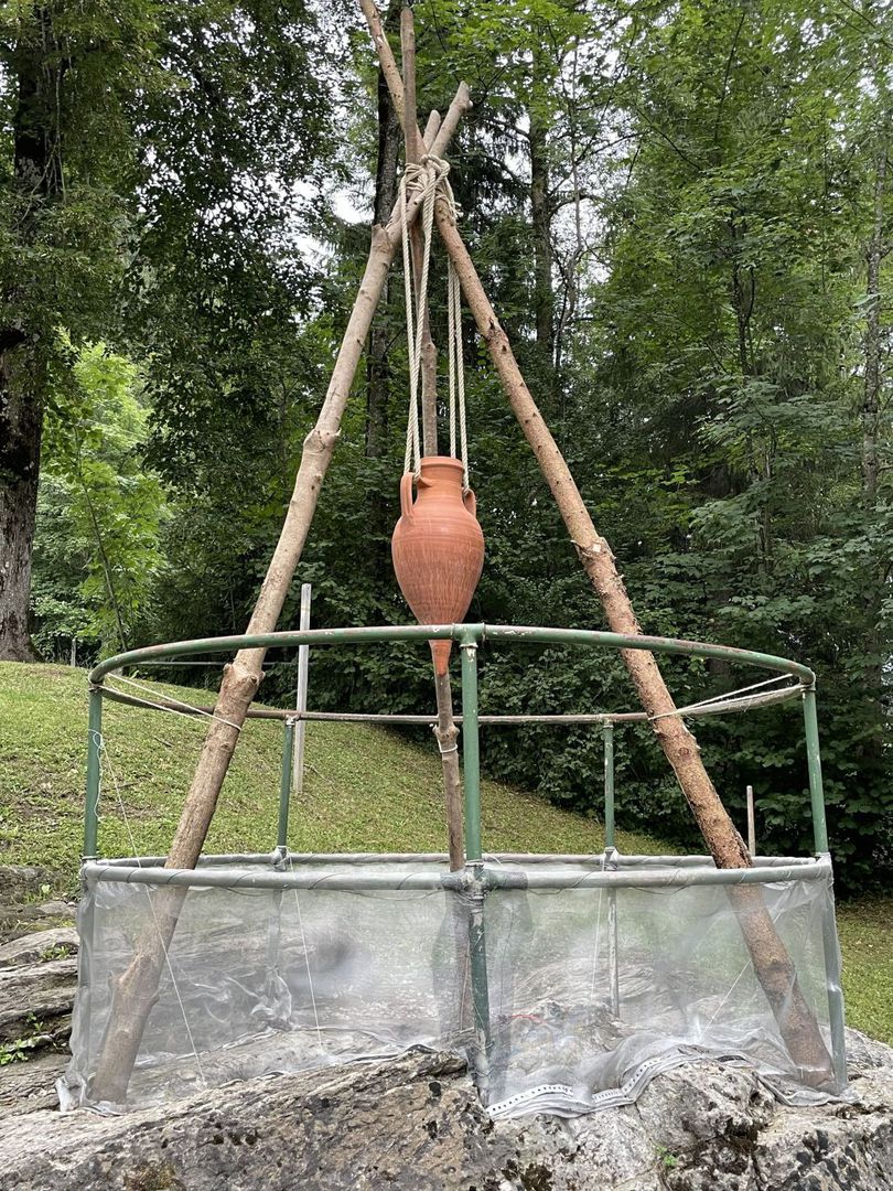 Die Tropfen aus der Amphore imitieren dieses natürliche Zeitmaß. Der Gletschertopf zeigt die Bedeutung und Wirkung von Dauer, wie auch die Wirkung vieler kleinen Prozesse: es waren nicht große Steine sondern Sand, die den Gletschertopf hervorbrachten.